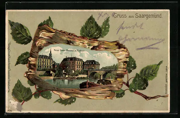 Lithographie Saargemünd, Neue Saar-Brücke mit Rothstrasse, Ansicht auf Birkenrinde