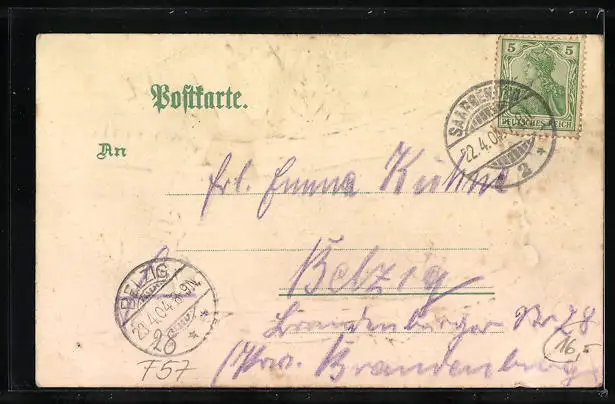 gelaufen 1904, Eckknick und Klebespur li. unten, Bugspur re. oben, guter Zustand