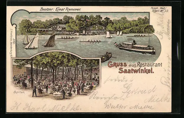 Lithographie Saatwinkel, Restaurant Saatwinkel mit Dampfer, Garten