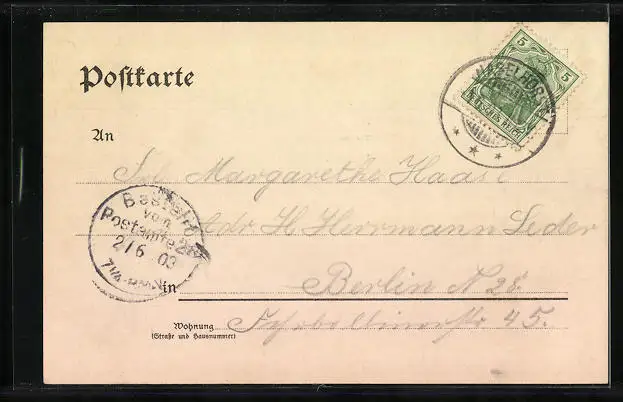 Personenbezogene Daten auf der Rückseite der Karte wurden durch blauen Textmarker unkenntlich gemacht. Die blauen Stellen sind auf die Vorderseite durchgeweicht und wirken sich negativ auf das Postkartenfoto aus