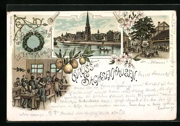 Lithographie Sachsenhausen, Totalansicht mit Gastwirtschaft