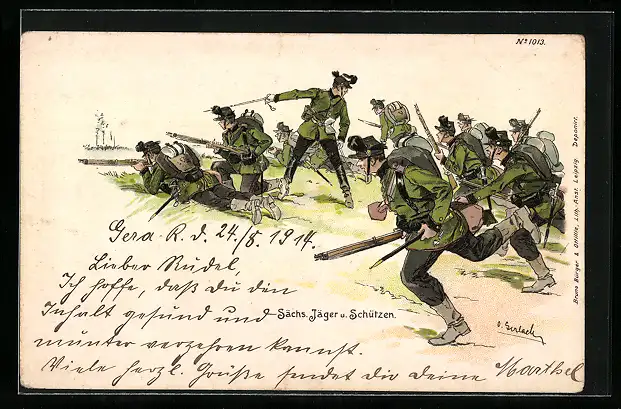 Lithographie Sächs. Jäger und Schützen in Uniform an der Front