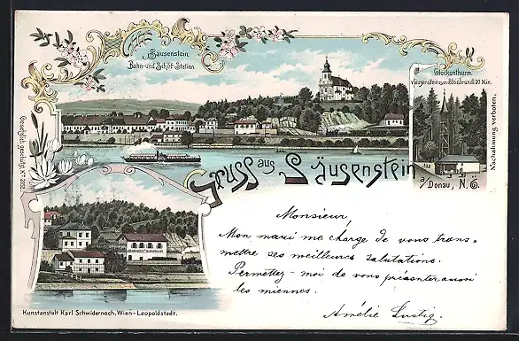 Lithographie Säusenstein a. Donau, Bahn- und Schiff-Stration, Glockenthurm, Johann Holtz`s Restaurant