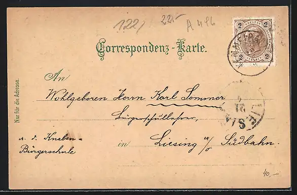 Personenbezogene Daten auf der Rückseite der Karte wurden durch blauen Textmarker unkenntlich gemacht. Die blauen Stellen sind auf die Vorderseite durchgeweicht und wirken sich negativ auf das Postkartenfoto aus