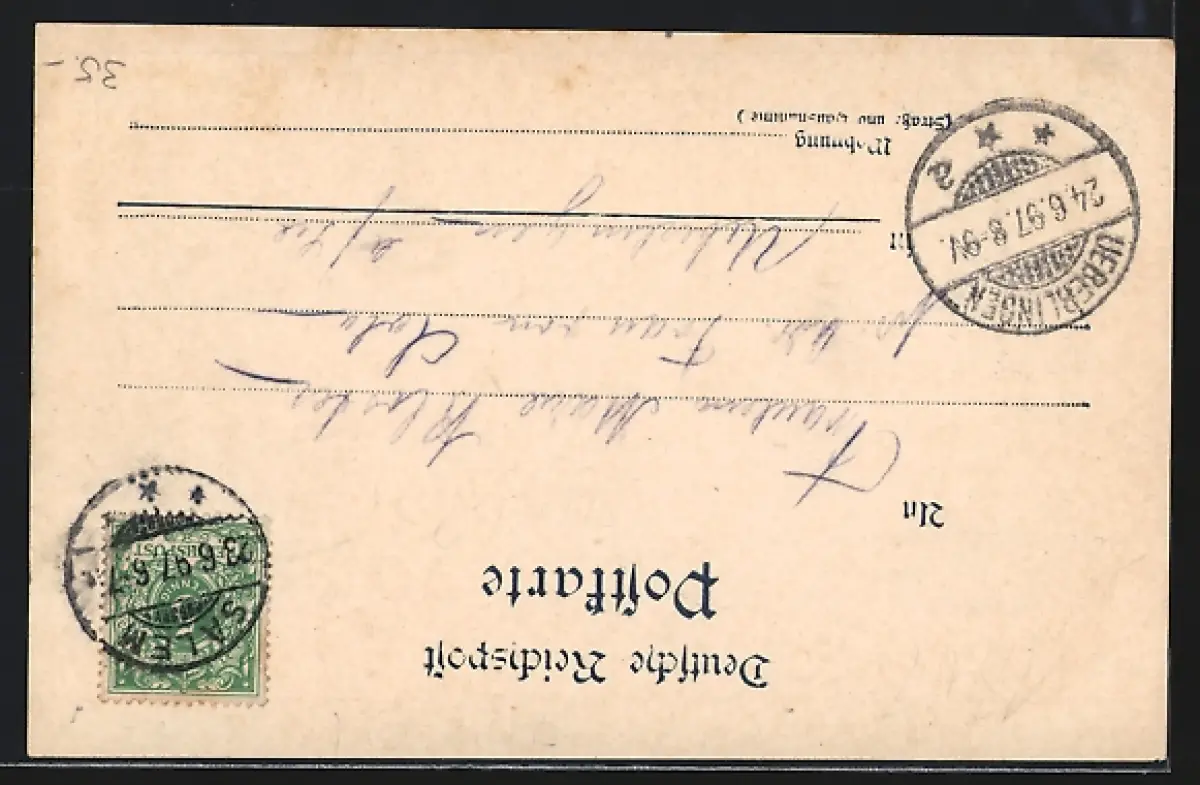 Personenbezogene Daten auf der Rückseite der Karte wurden durch blauen Textmarker unkenntlich gemacht. Die blauen Stellen sind auf die Vorderseite durchgeweicht und wirken sich negativ auf das Postkartenfoto aus