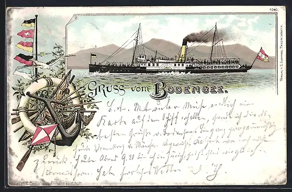 Lithographie Salondampfer Raddampfer fährt auf dem Bodensee