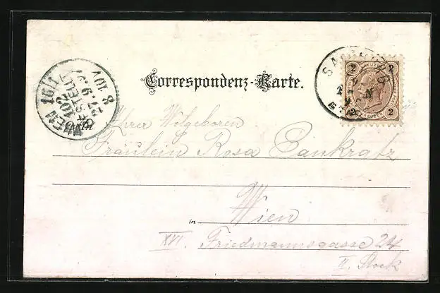 Personenbezogene Daten auf der Rückseite der Karte wurden durch blauen Textmarker unkenntlich gemacht. Die blauen Stellen sind auf die Vorderseite durchgeweicht und wirken sich negativ auf das Postkartenfoto aus