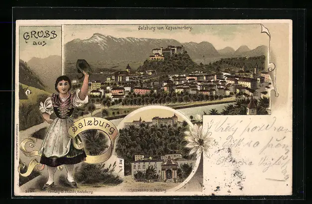 Lithographie Salzburg, Totalansicht vom Kapizinerberg, Festung