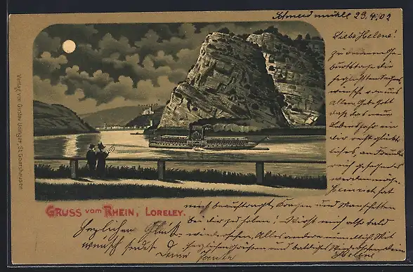 Lithographie Sankt Goarshausen / Rhein, Blick auf die Loreley