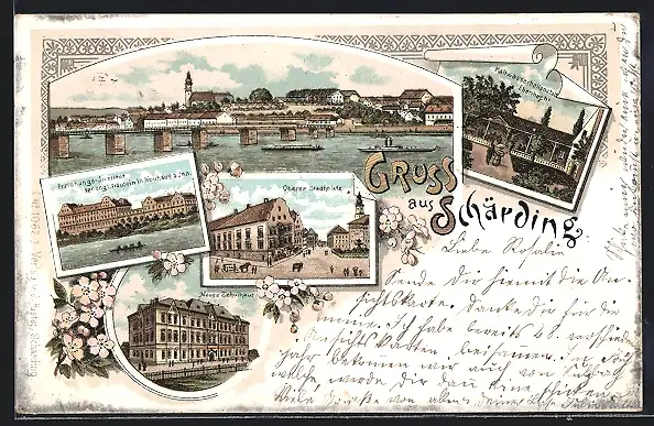 Lithographie Schärding, Teilansicht, Oberer Stadtplatz, Neues Schulhaus