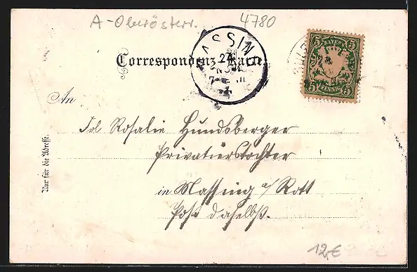 Personenbezogene Daten auf der Rückseite der Karte wurden durch blauen Textmarker unkenntlich gemacht. Die blauen Stellen sind auf die Vorderseite durchgeweicht und wirken sich negativ auf das Postkartenfoto aus