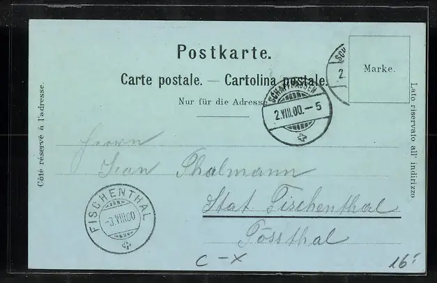 Personenbezogene Daten auf der Rückseite der Karte wurden durch blauen Textmarker unkenntlich gemacht. Die blauen Stellen sind auf die Vorderseite durchgeweicht und wirken sich negativ auf das Postkartenfoto aus