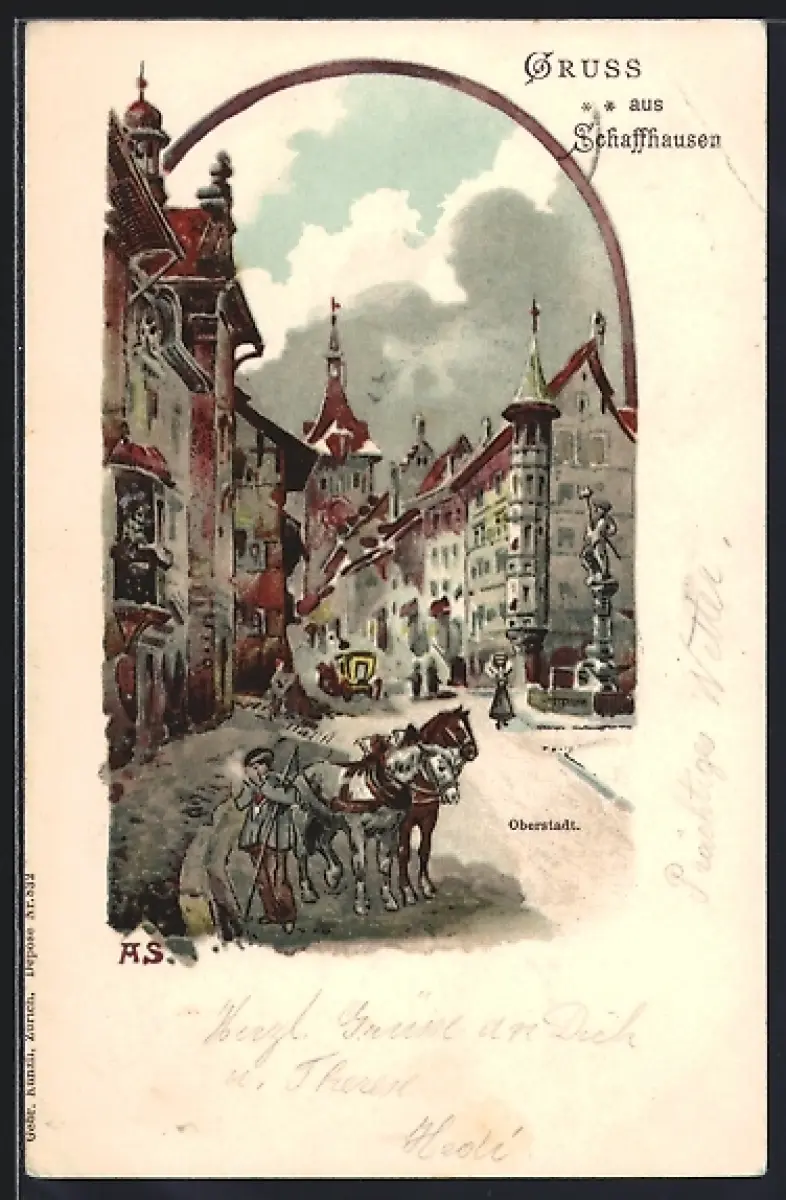 Lithographie Schaffhausen, Oberstadt, Ortspartie mit Brunnen