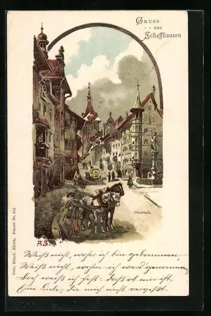 Lithographie Schaffhausen, Partie in der Oberstadt mit Denkmal