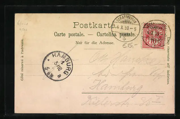Personenbezogene Daten auf der Rückseite der Karte wurden durch blauen Textmarker unkenntlich gemacht. Die blauen Stellen sind auf die Vorderseite durchgeweicht und wirken sich negativ auf das Postkartenfoto aus