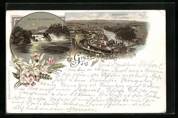 Lithographie Schaffhausen, Teilansicht von Südwesten, Rheinfall bei Mondschein