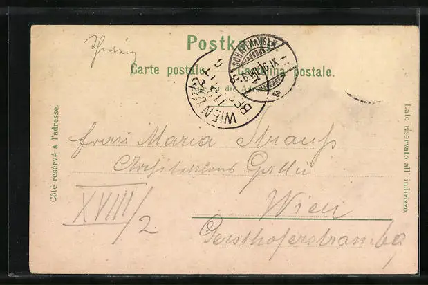 Personenbezogene Daten auf der Rückseite der Karte wurden durch blauen Textmarker unkenntlich gemacht. Die blauen Stellen sind auf die Vorderseite durchgeweicht und wirken sich negativ auf das Postkartenfoto aus