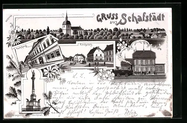 Lithographie Schafstädt, Ortsansicht, Bahnhof, Kirchplatz, Rathaus