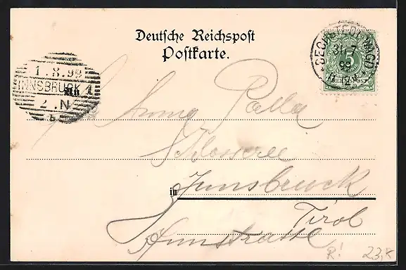 Personenbezogene Daten auf der Rückseite der Karte wurden durch blauen Textmarker unkenntlich gemacht. Die blauen Stellen sind auf die Vorderseite durchgeweicht und wirken sich negativ auf das Postkartenfoto aus