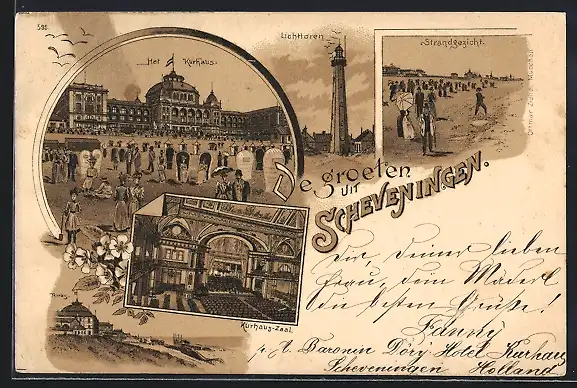Lithographie Scheveningen, Kurhaus, Lichttoren, Strandgezicht
