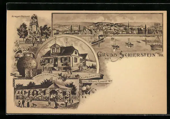 Lithographie Schierstein a. Rh., Panorama vom Wasser, Gasthaus A. Ermert mit Garten