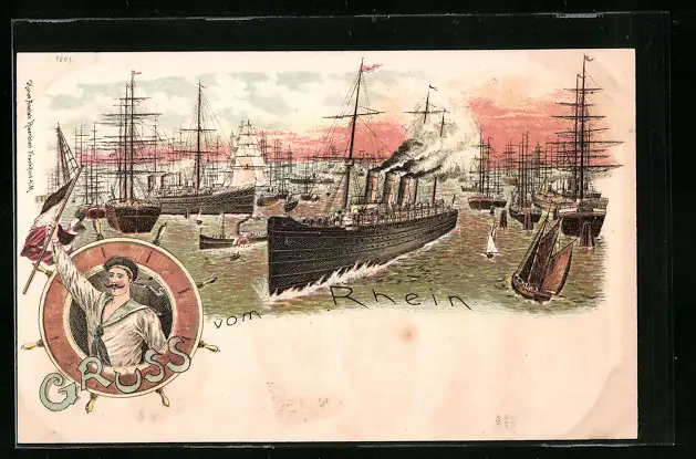 Lithographie Schiffsverkehr auf dem Rhein, Matrose im Rettungsring