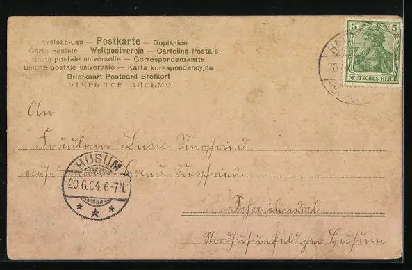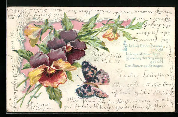 Personenbezogene Daten auf der Rückseite der Karte wurden durch blauen Textmarker unkenntlich gemacht. Die blauen Stellen sind auf die Vorderseite durchgeweicht und wirken sich negativ auf das Postkartenfoto aus