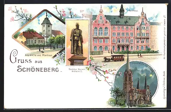 Lithographie Schöneberg, Alte Kirche und Pfarrhaus, Rathaus