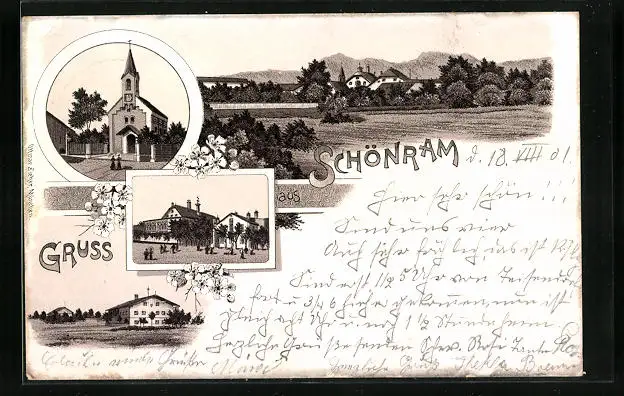 Lithographie Schönram, Kirche, Ortspartie, Teilansicht der Ortschaft