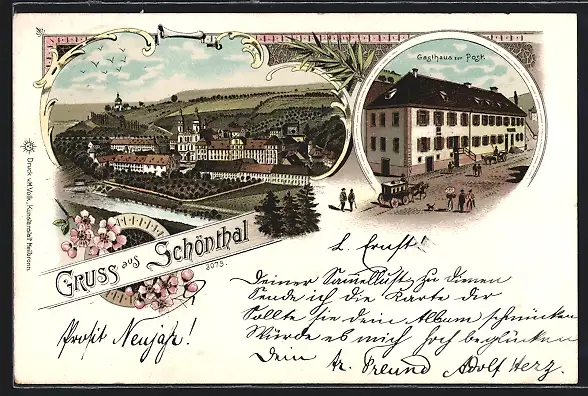 Lithographie Schöntal, Gasthaus zur Post, Ortsansicht