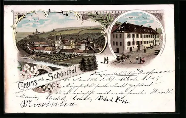 Lithographie Schönthal, Gasthaus zur Post, Ortsansicht