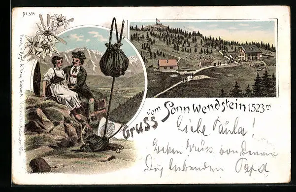 Lithographie Schottwien, Sonnwendstein, Gesamtansicht, Bergsteiger bei einer Rast