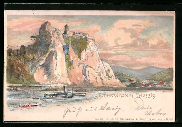 Lithographie Schreckenstein, Elbestrand mit Dampferpartie