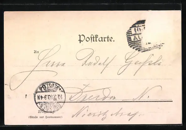 Personenbezogene Daten auf der Rückseite der Karte wurden durch blauen Textmarker unkenntlich gemacht. Die blauen Stellen sind auf die Vorderseite durchgeweicht und wirken sich negativ auf das Postkartenfoto aus