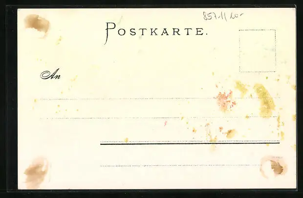 Personenbezogene Daten auf der Rückseite der Karte wurden durch blauen Textmarker unkenntlich gemacht. Die blauen Stellen sind auf die Vorderseite durchgeweicht und wirken sich negativ auf das Postkartenfoto aus