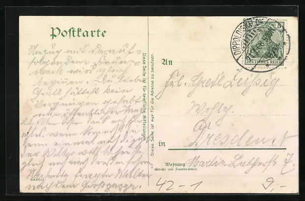 Personenbezogene Daten auf der Rückseite der Karte wurden durch blauen Textmarker unkenntlich gemacht. Die blauen Stellen sind auf die Vorderseite durchgeweicht und wirken sich negativ auf das Postkartenfoto aus