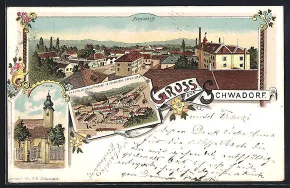 Lithographie Schwadorf, Baumwollspinnerei, Kirche und Totalansicht