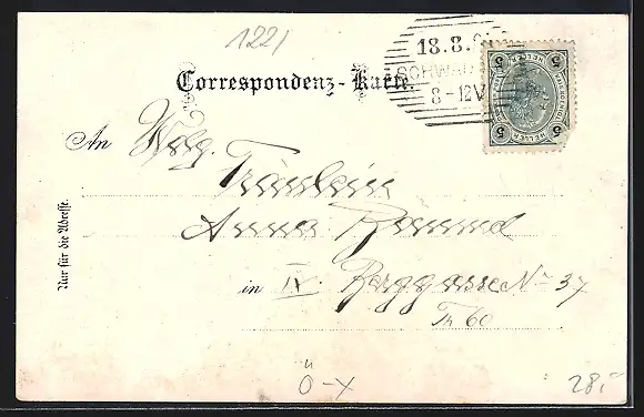 Personenbezogene Daten auf der Rückseite der Karte wurden durch blauen Textmarker unkenntlich gemacht. Die blauen Stellen sind auf die Vorderseite durchgeweicht und wirken sich negativ auf das Postkartenfoto aus
