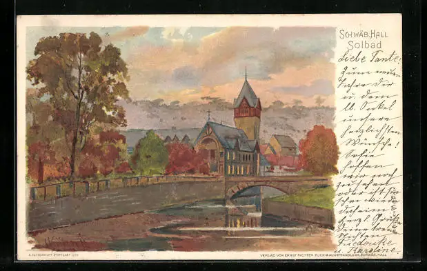 Lithographie Schwäb. Hall, Herbstlicher Blick auf das Solbad