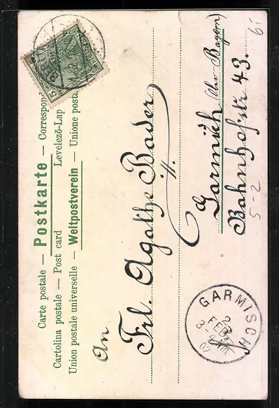 Personenbezogene Daten auf der Rückseite der Karte wurden durch blauen Textmarker unkenntlich gemacht. Die blauen Stellen sind auf die Vorderseite durchgeweicht und wirken sich negativ auf das Postkartenfoto aus