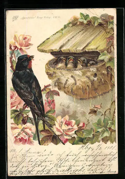 Lithographie Schwalbenmutter bringt hungrigen Jungen einen Wurm