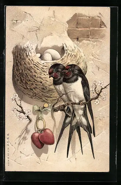 Lithographie Schwalbenpaar vor Nest mit Eiern