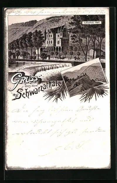 Lithographie Schwarzathale, Ansicht mit Fluss, Lösches Hall