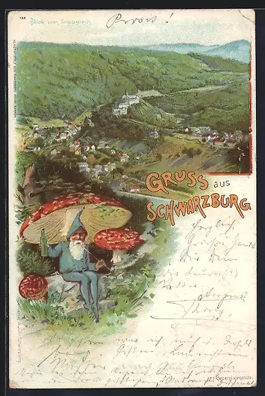 Lithographie Schwarzburg, Blick vom Trippstein auf den Ort, Zwerg unterm Fliegenpilz