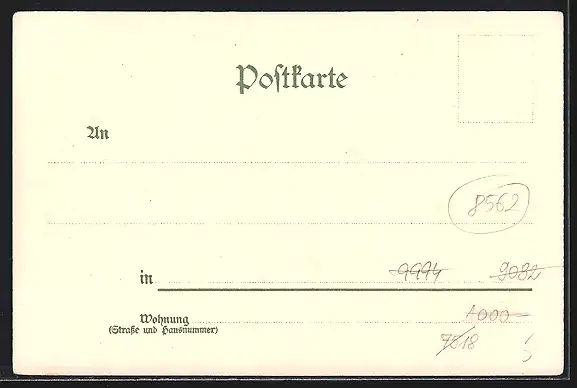 Personenbezogene Daten auf der Rückseite der Karte wurden durch blauen Textmarker unkenntlich gemacht. Die blauen Stellen sind auf die Vorderseite durchgeweicht und wirken sich negativ auf das Postkartenfoto aus