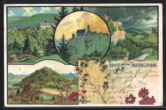 Lithographie Schwarzburg, Wartburg, Drei Gleichen