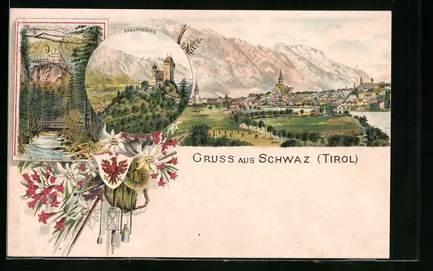 Lithographie Schwaz, Ortsansicht mit Freundsberg