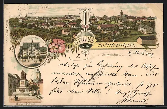 Lithographie Schweinfurt, Totalansicht, Rathaus, Rückertdenkmal