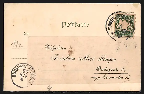 gelaufen 1897, rück- u. vorderseitig Klebe- und Papierreste, Eckknick oben re., guter Zustand
