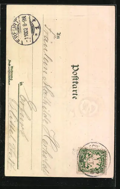 Personenbezogene Daten auf der Rückseite der Karte wurden durch blauen Textmarker unkenntlich gemacht. Die blauen Stellen sind auf die Vorderseite durchgeweicht und wirken sich negativ auf das Postkartenfoto aus